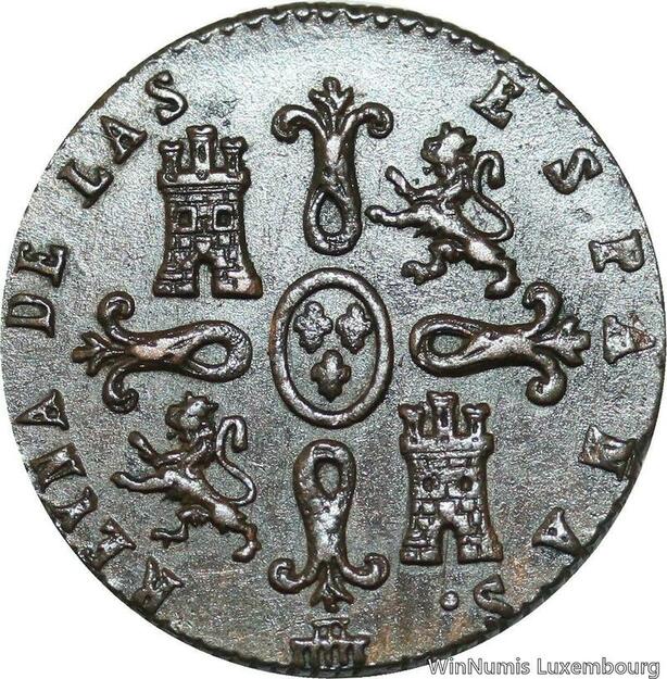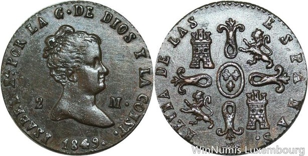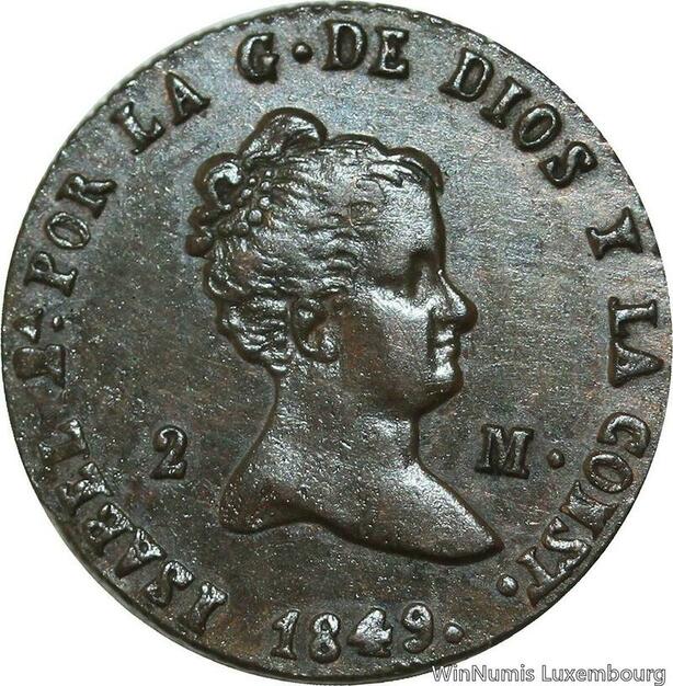 P5935 Rare Spain 2 Maravedis Isabel II 1849 UNC -> M Offer