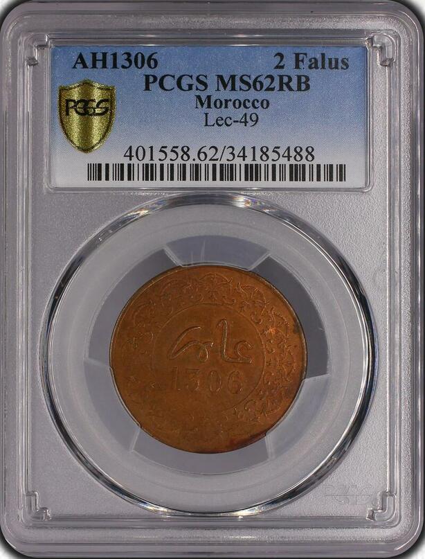O551 Scarce Morocco Moulay Al-Hasan I 2 Falus AH 1306 1888 Fes PCGS MS62