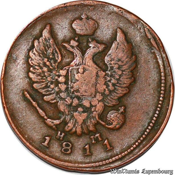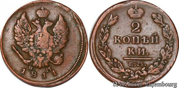 S5373 Russie 2 Kopecks Alexander I 1811 EM-HM Saint Petersburg Frappe Casquette