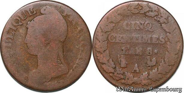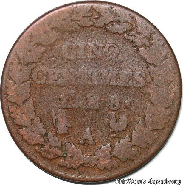 S5521 Rare France 5 Centimes Dupré An 8 A Paris Coq / Corne Abondance