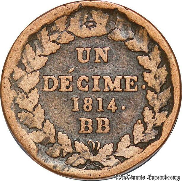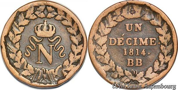 S5619 Rare France 1 Décime à l'N couronnée 1814 BB Palet de Jeu - Faire Offre