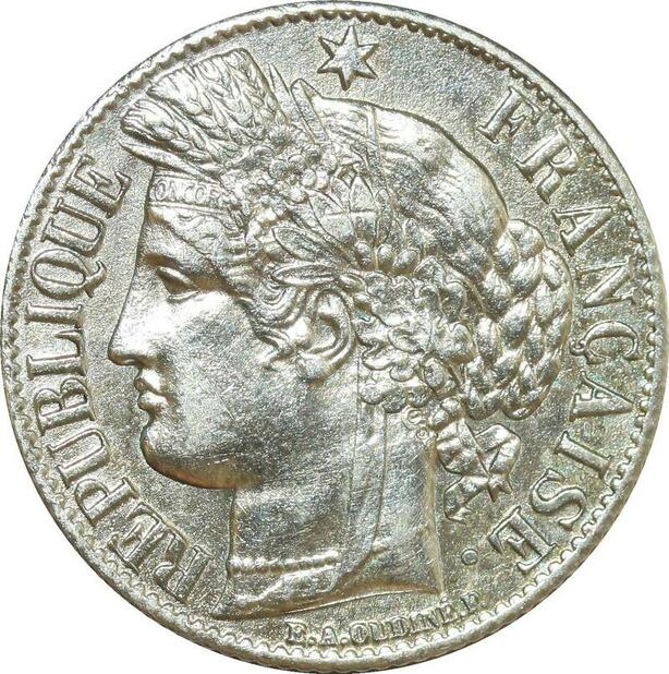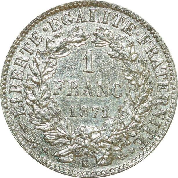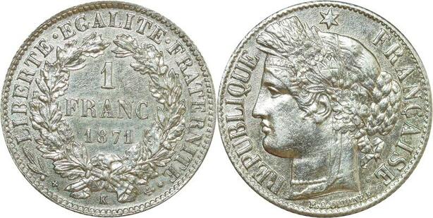 O8789 Rare France 1 Franc Cérès 1871 K Bordeaux Argent SUP +++ ->Make offer