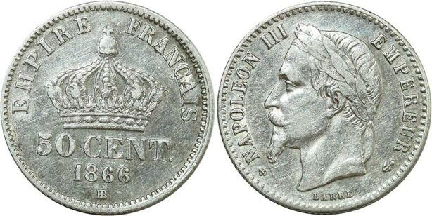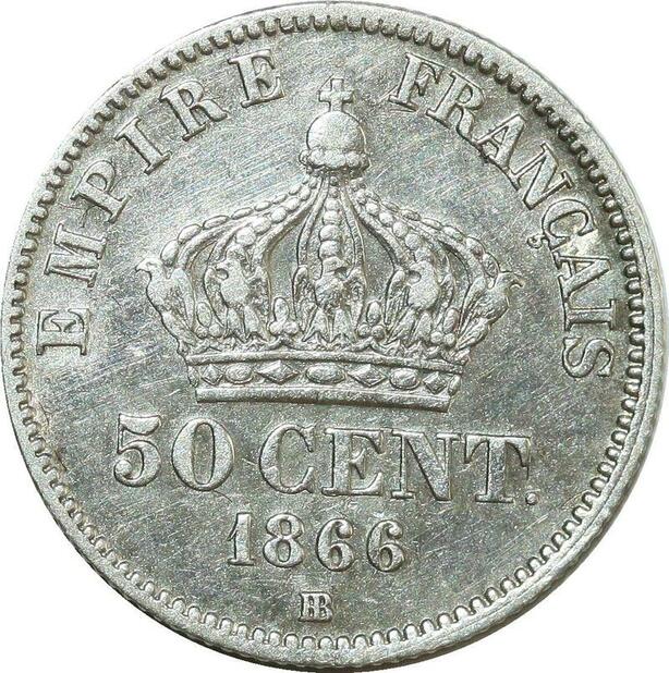 O8885 Rare France 50 Centimes Napoléon III 1866 BB Strasbourg Argent SUP
