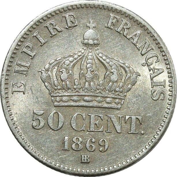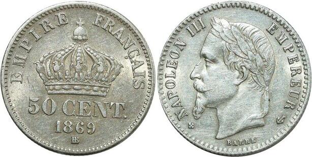 O8894 Finest France 50 Centimes Napoléon III 1869 BB Strasbourg Argent PCGS AU55
