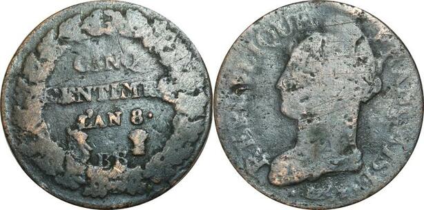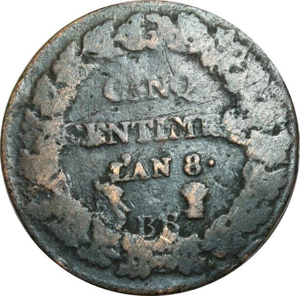 O9234 Directoire Rare 5 Centimes Dupré an 8/5 BB Strasbourg / A Paris
