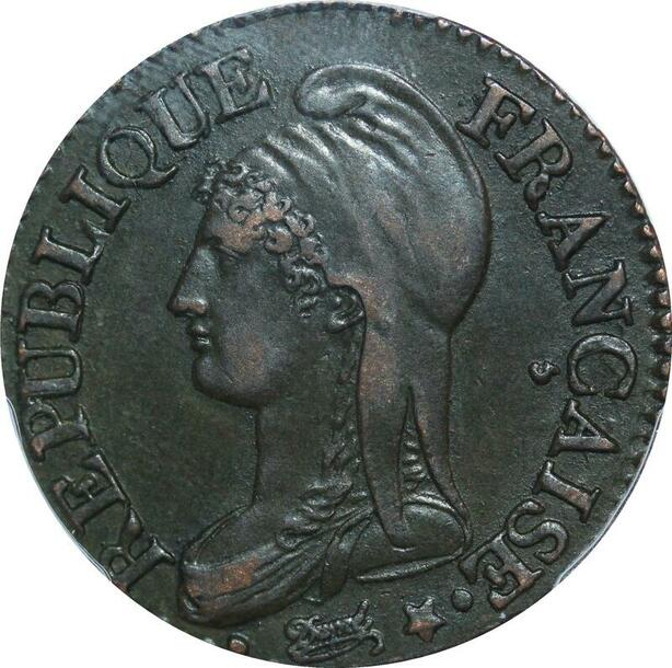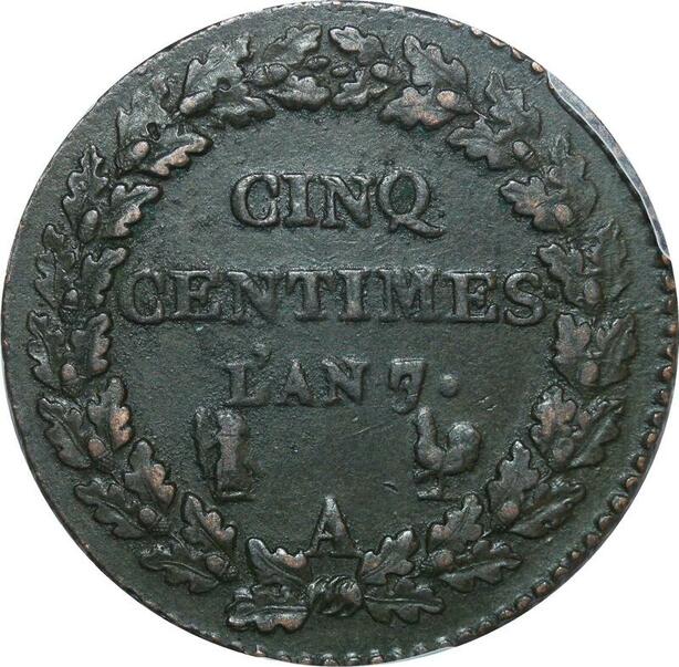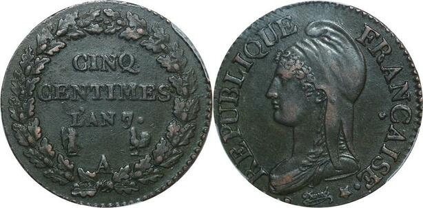 O9374 Directoire Très rare 5 Centimes Dupré an 7/5 A Paris PCGS AU58