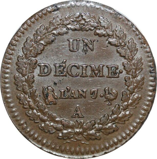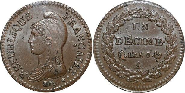 O9443 Finest Rare France Directoire Un Décime Dupré An 7/5 PCGS MS62 SPL !