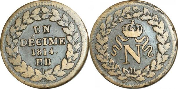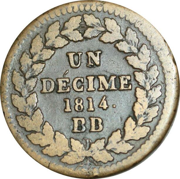 O9502 France Rare Un Décime Napoléon N couronné 1814 BB Strasbourg 1 point