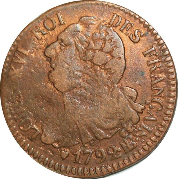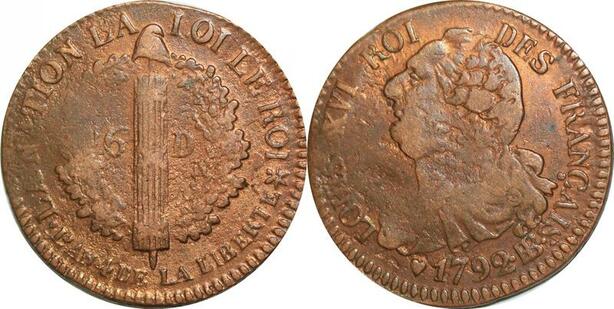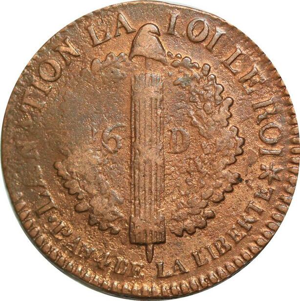 O9530 Rare France Constitution 6 Deniers Louis XVI Francais An 4 1792 BB Strasbourg