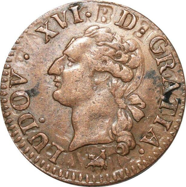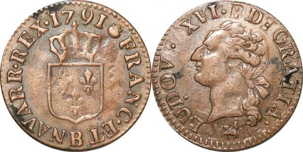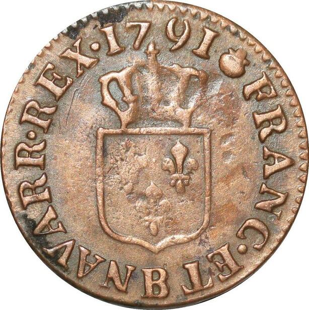 O9604 Rare France Coin choqué Liard Louis XVI 1791 B Rouen 2ème semestre ->Make offer