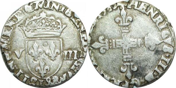 O9648 Rare France 1/8 Ecu Henri III 1583 L Bayonne Argent ->Make offer