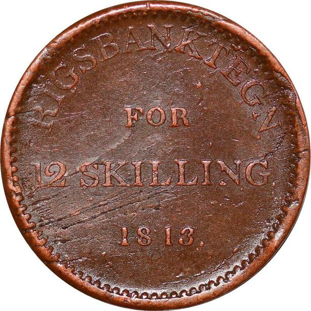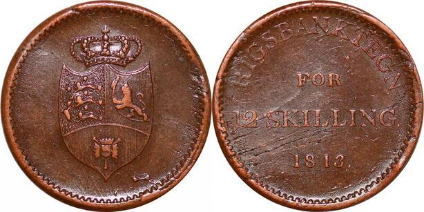 O9946 Scarce Denmark 12 Skilling Frederik VI Rigsbank Token 1813 UNC