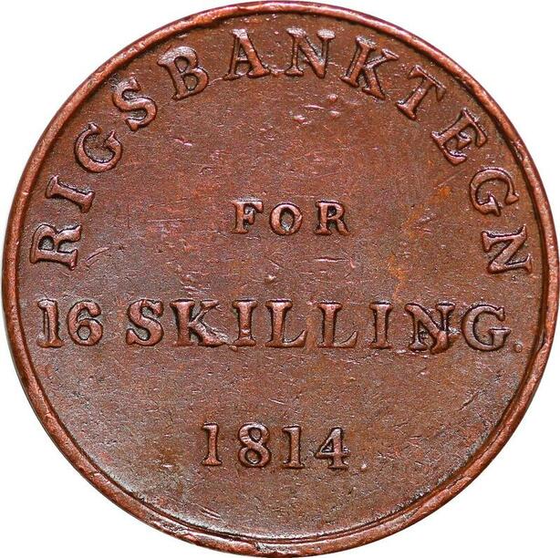 O9948 Scarce Denmark 16 Skilling Frederik VI Rigsbank Token 1814 AU / UNC