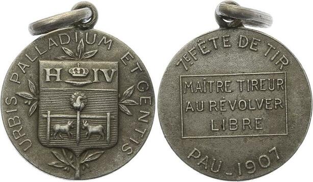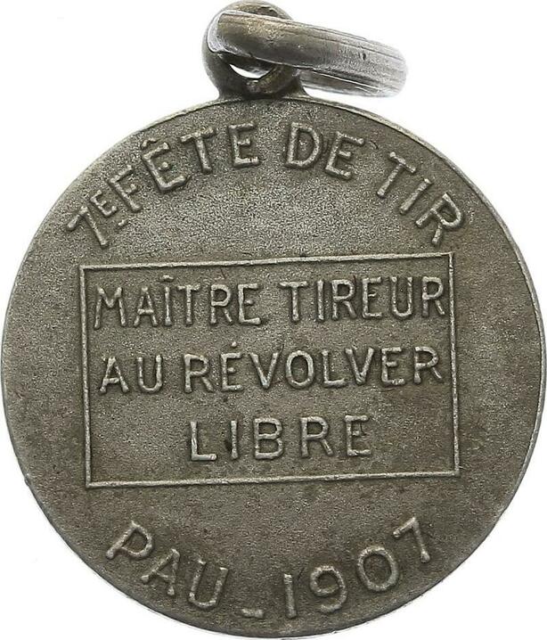 O4526 Medaille Fête de Tir Maître Tireur Révolver Libre Pau 1907 Argent
