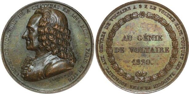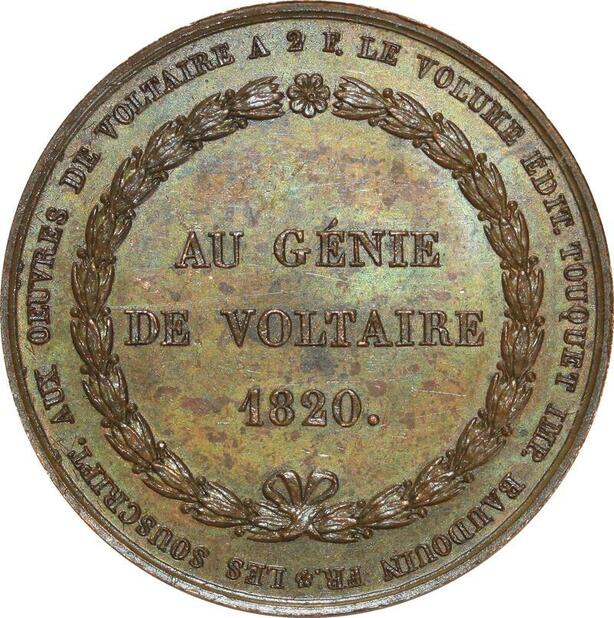 O5335 Medaille Au génie de Arquet de Voltaire 1820 Caqué Baron Desnoyers SUP