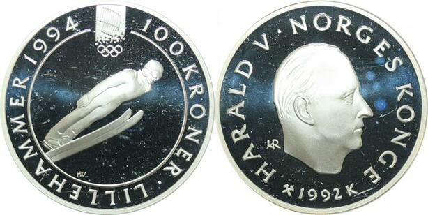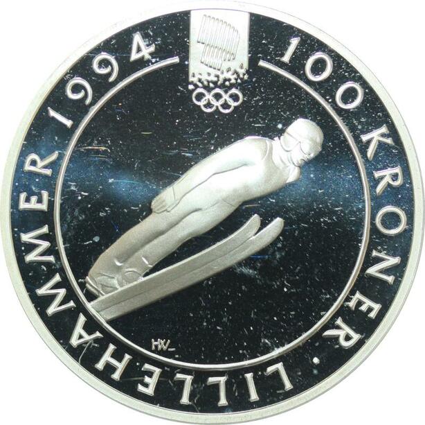 Q0169 Norway Olympics Games 100 Kroner Harald V Lillehammer 1994 Silver PF