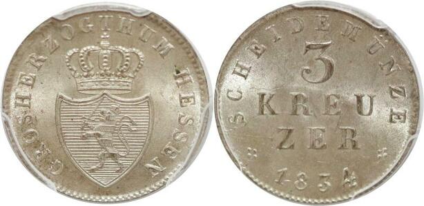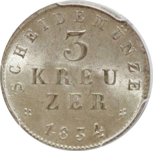 Q0416 Rare Finest Germany Hesse Darmstadt 3 Kreuzer 1834 PCGS MS66