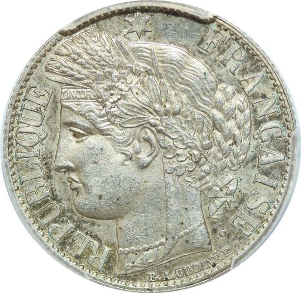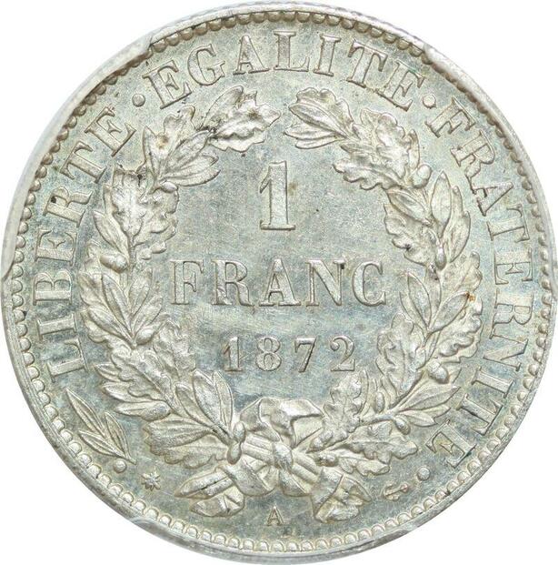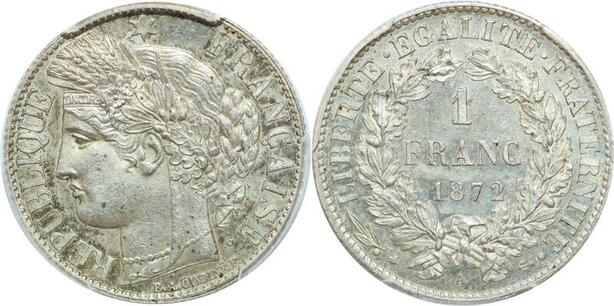 Q0423 Rare France 1 Franc Cérès 1872 A PCGS SPL