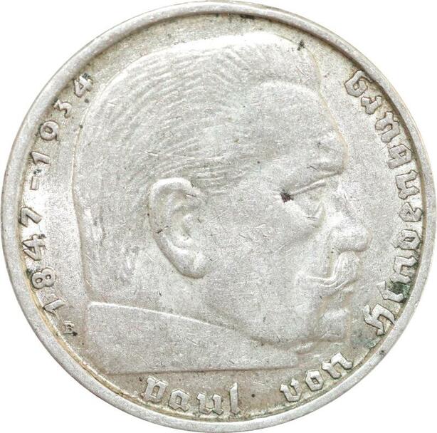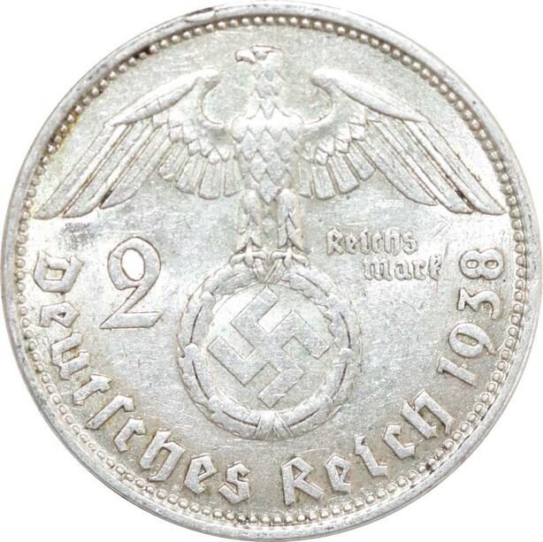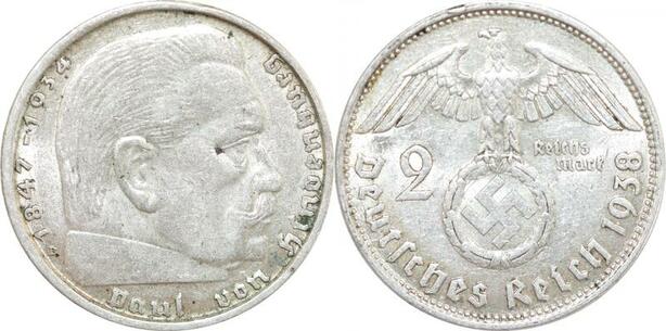 Q0491 Germany 2 Reichsmark Hinbenburg 1938 B Silver AU > Offer