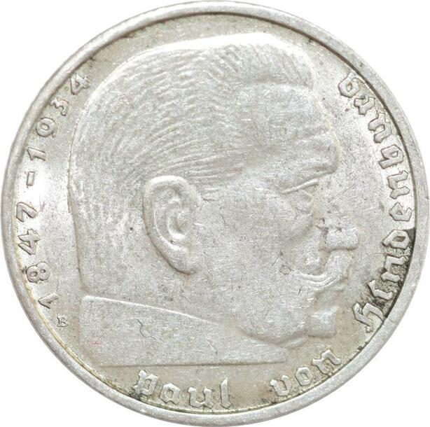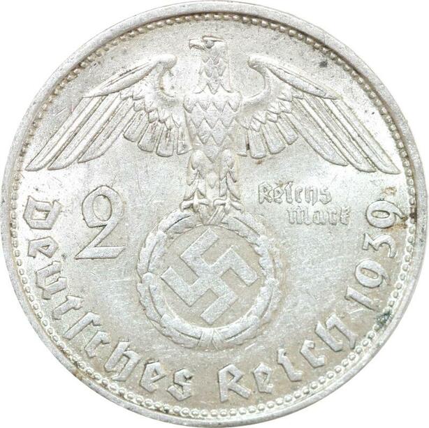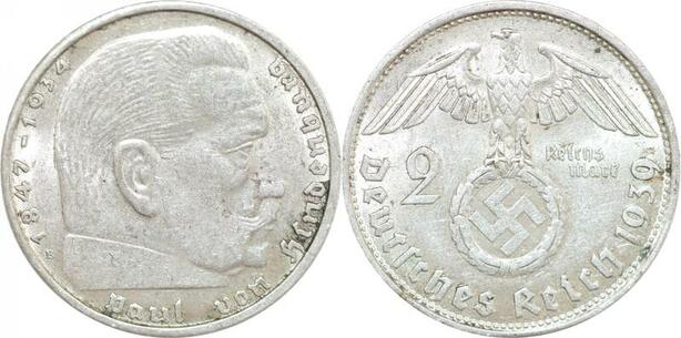 Q0493 Germany 2 Reichsmark Hinbenburg 1939 B Silver AU > Offer