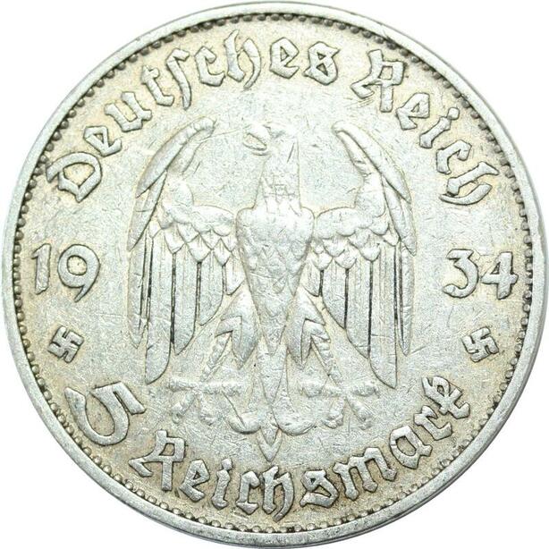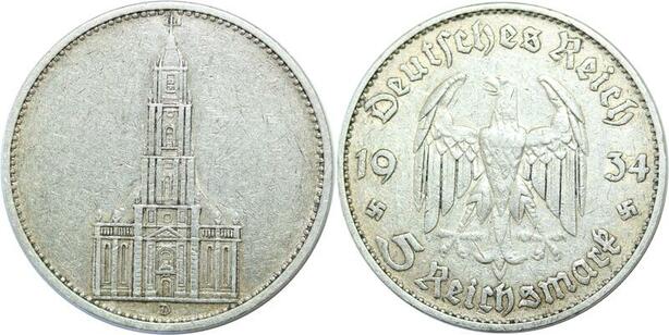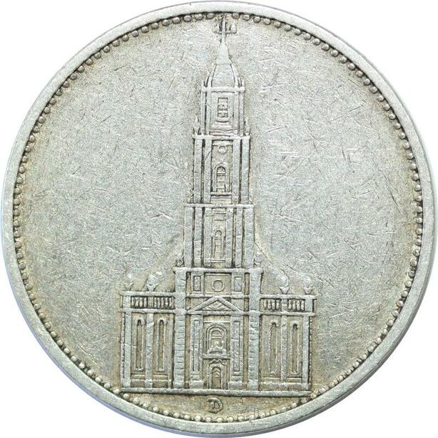 Q0513 Germany Bayern 5 Reichsmark Potsdam Garrison Church 1934 D Silver