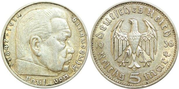 Q0528 Germany Wurttemberg 5 Reichsmark Hinbenburg 1936 F Silver > Make Offer