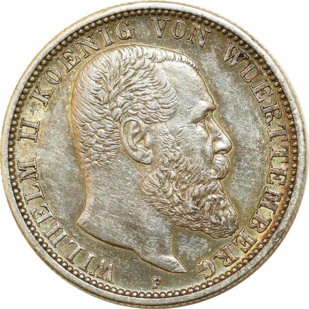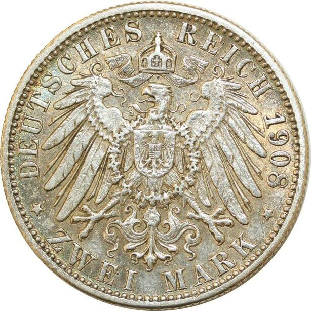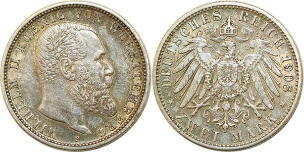 Q0542 Germany Wurttemberg 2 Mark Wilhelm II 1908 F Silver AU > Make Offer