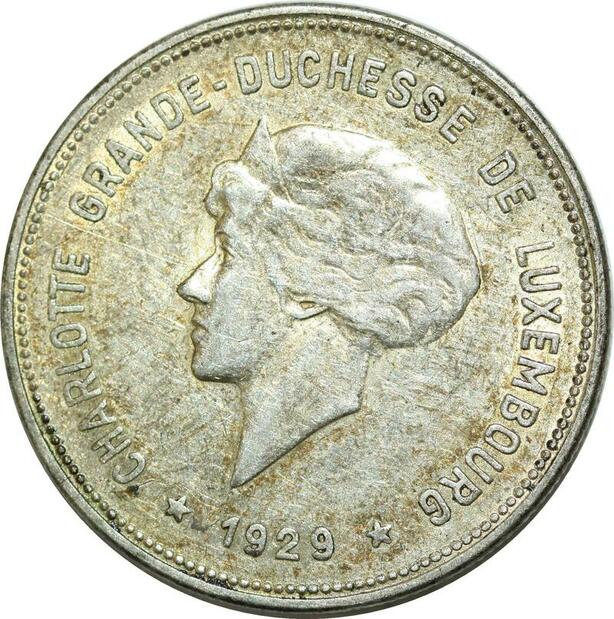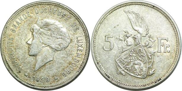 Q0616 Luxembourg 5 Francs Grande Duchesse Charlotte 1929 Silver AU > Offer