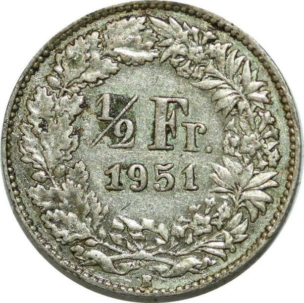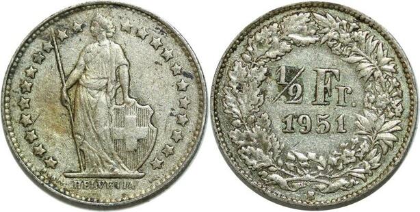 Q0628 Switzerland 1/2 Franc Suisse Helvetia 1951 B Berne Silver > M Offer