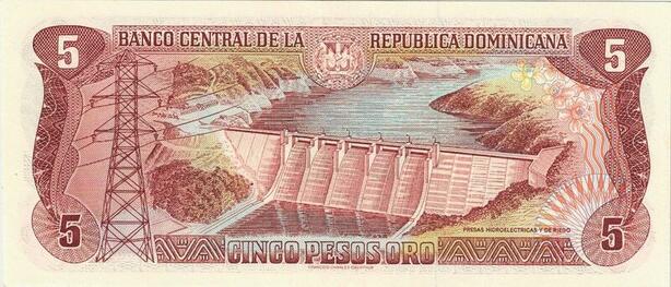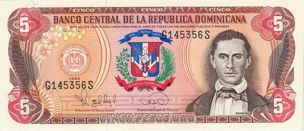 Q0658 Banknote Dominican Republic 5 Pesos Francisco Sánchez 1996 UNC