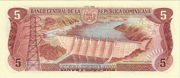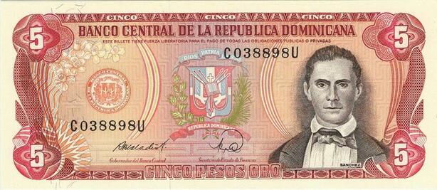 Q0659 Banknote Dominican Republic 5 Pesos Francisco Sánchez 1988 UNC