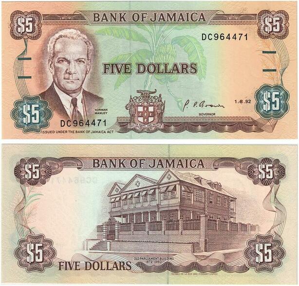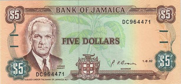 Q0673 Banknote South America Jamaica 5 Dollars Norman Manley 1992 UNC