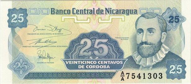 Q0726 Banknote Nicaragua 25 Centavos Francisco Hernandez de Cordoba UNC