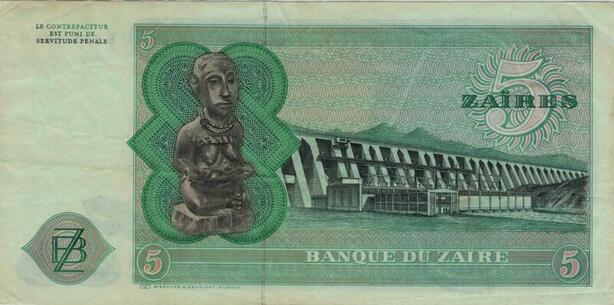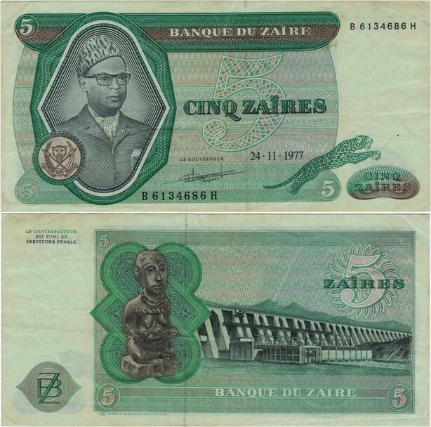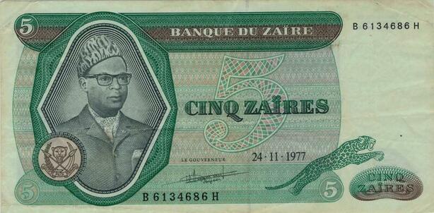 Q1141 Banknote Zaire Congo 5 Zaires Mobutu Sese Seko 1977 AU -> Make Offer