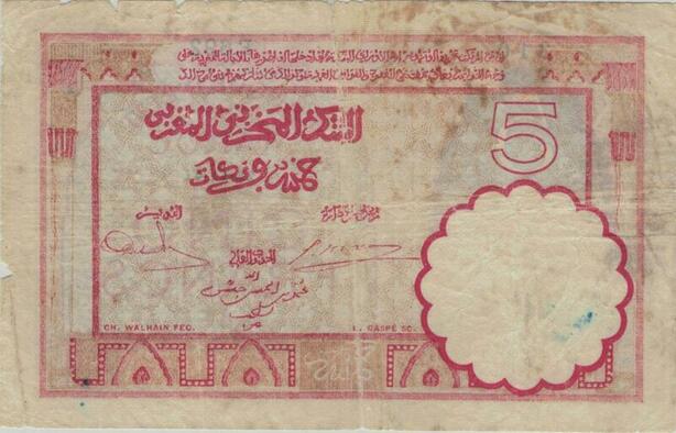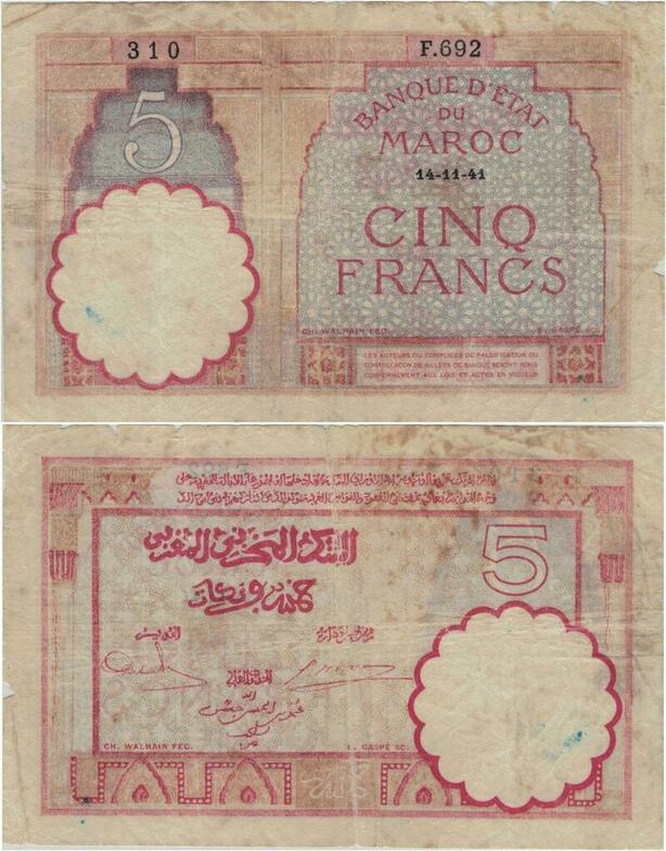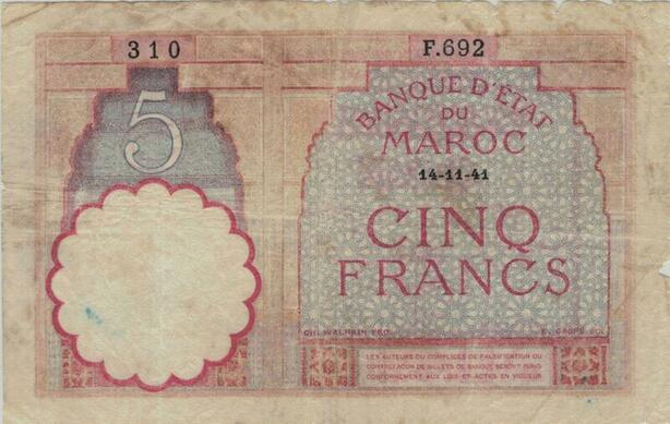 Q1299 Banknote Morocco 5 Francs 1941 -> Make offer