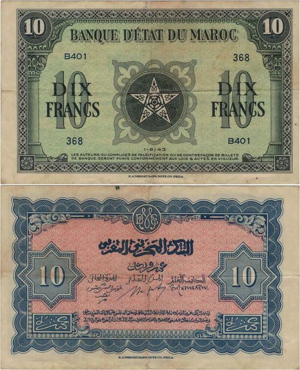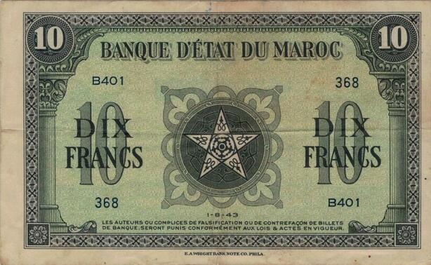 Q1300 Banknote Morocco 10 Francs Guessous Bapst 1943 -> Make offer