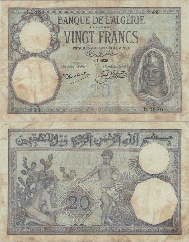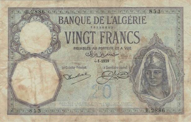Q1329 Rare Banknote Algeria 20 Francs 1929 -> Make offer