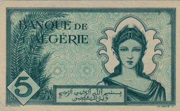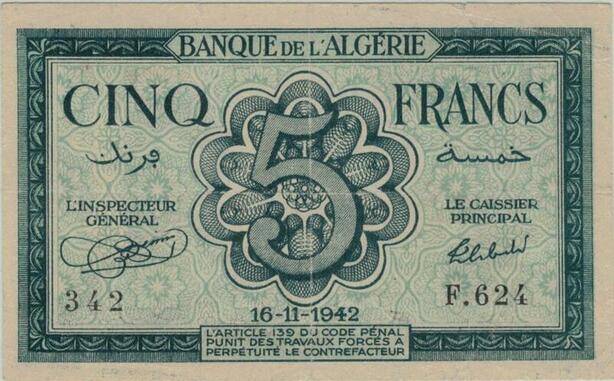 Q1338 Banknote Algeria 5 Francs 1942 AU -> Make offer