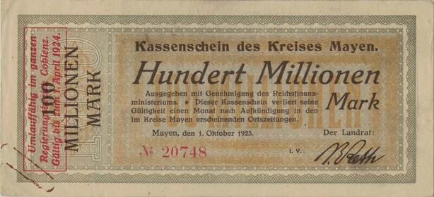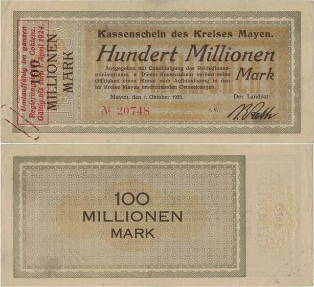 Q1396 Banknote Germany Coblenz Mayen 100 Millionen Marks 1923 AU -> M offer