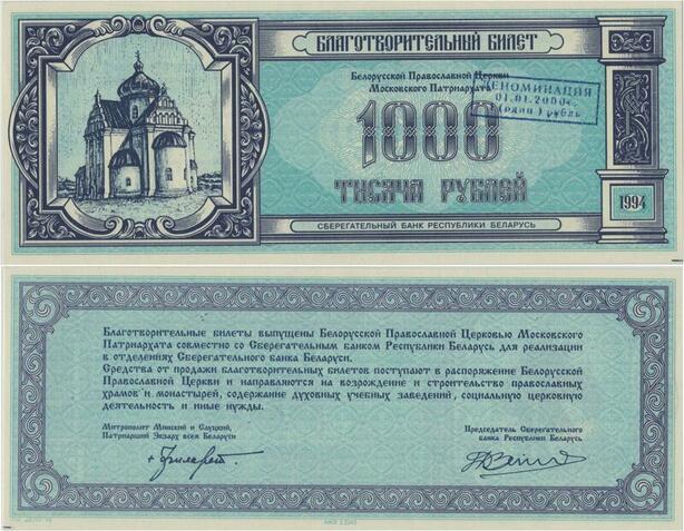 Q1430 Banknote Belarus Orthodox Church 1000 Roubles 1994 UNC -> Make offer