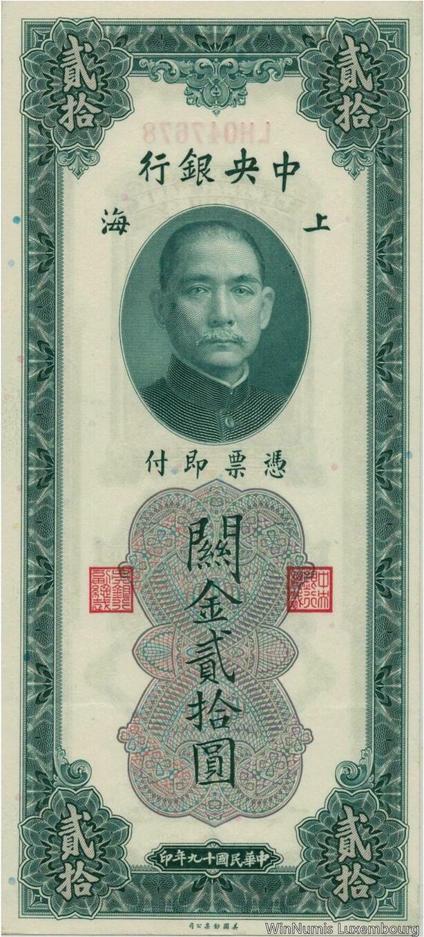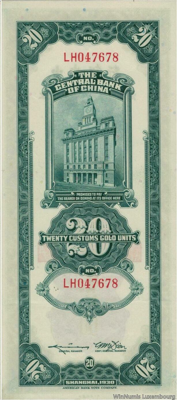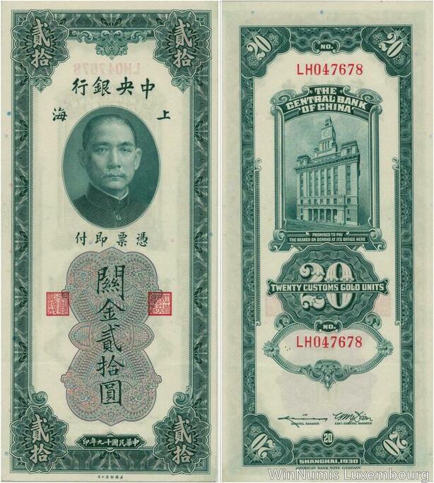 Q1435 Banknote China 20 Customs Gold Units Shangai Sun Yat-sen 1930 UNC