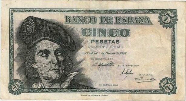 Q1828 Banknote Spain 5 Pesetas Juan Sebastián El Cano 1948 -> Make offer