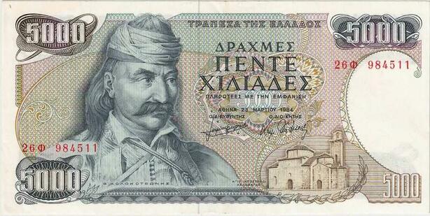 Q1909 Banknote Greece 5000 Drachmai Theodoros Kolokotronis 1984 AU