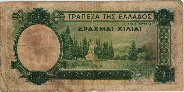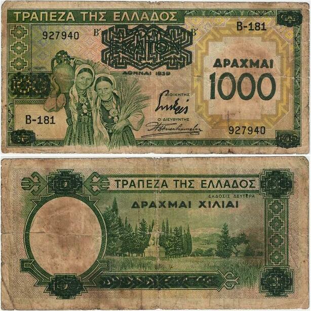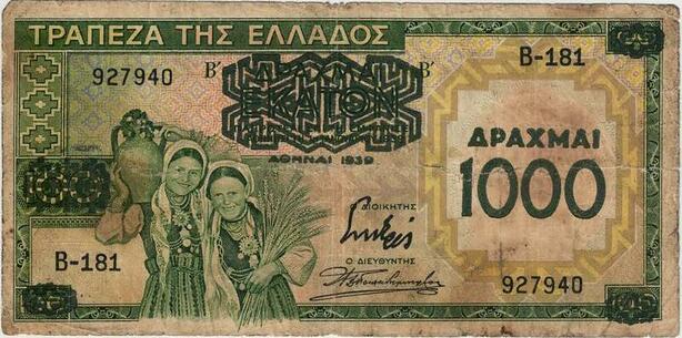 Q1913 Banknote Greece 1000 Drachmai / 100 Drachmes 1939 -> Make offer