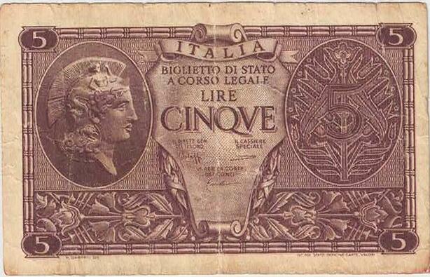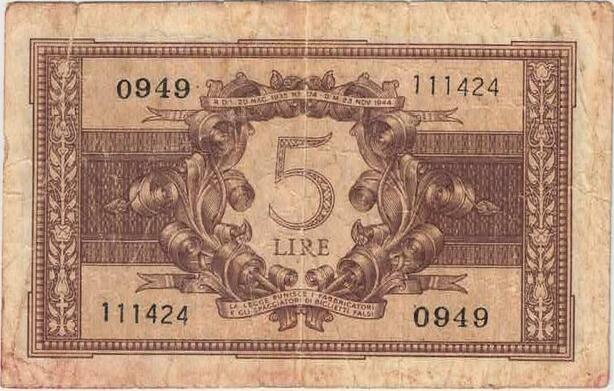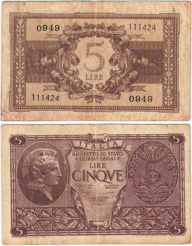 Q1935 Banknote Italy 5 Lire Helmeted Italia Luogotenenza 1944 -> Make offer