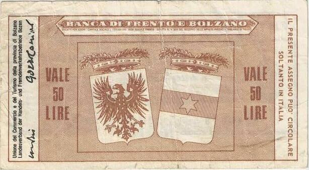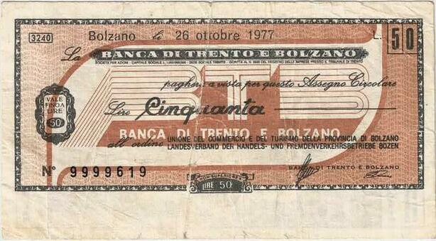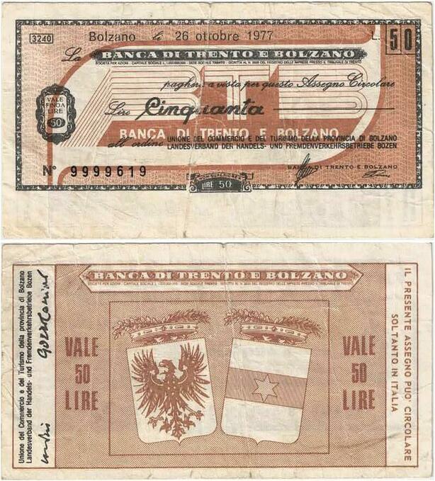 Q1939 Italy 50 Lire 1977 Miniassegni Banca di Trento e Bolzano > Make offer