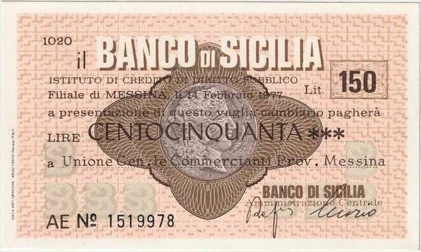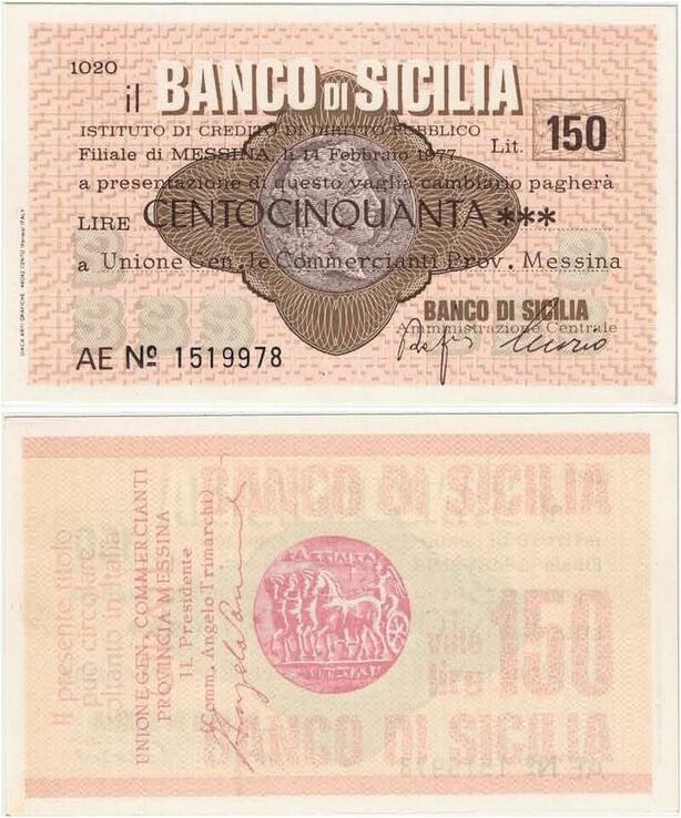 Q1989 Banknote Italy 150 Lire Banco di Sicilia 1977 UNC -> Make offer