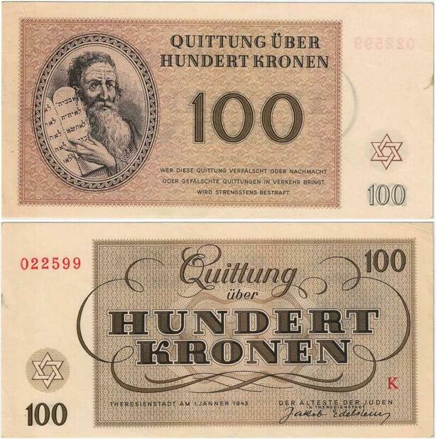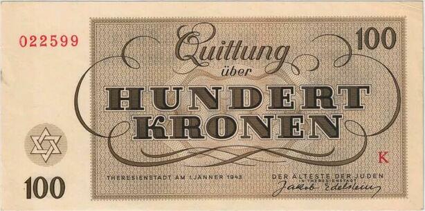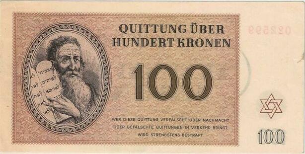 Q2012 Rare Czechoslovakia Ghetto Theresienstadt Judaica 100 Kronen 1943 UNC