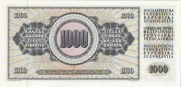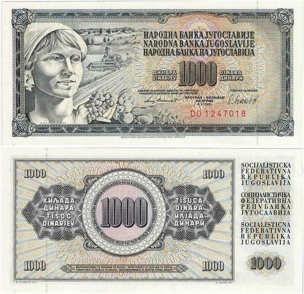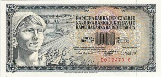Q2260 Banknote Yugoslavia 1000 Dinara Paysanne Fruits Moissonneuse 1981 UNC