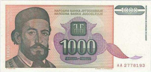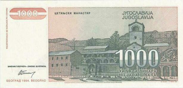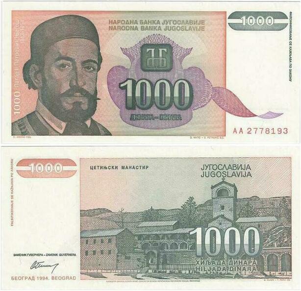 Q2290 Yugoslavia 1000 Dinara Petar II Petrović-Njegoš Cetinje 1994 UNC